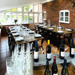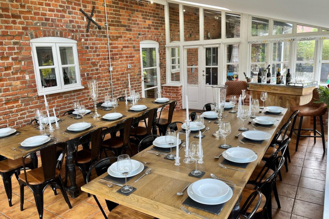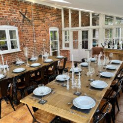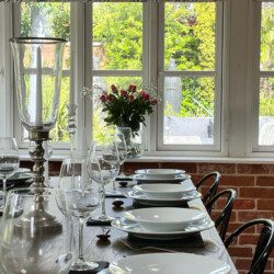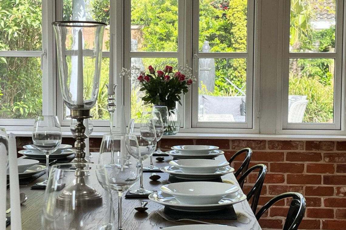 The impressive Dining room boasts 180 degree views of the garden, and seats 20 guests along 2 dining tables.