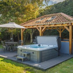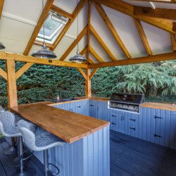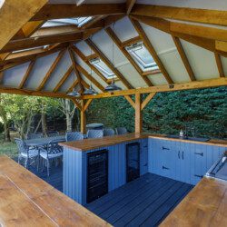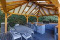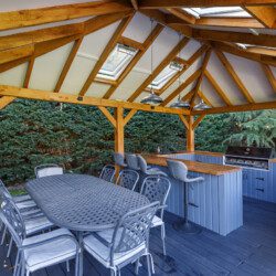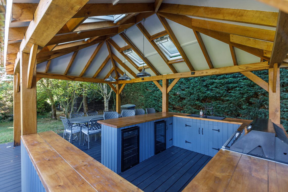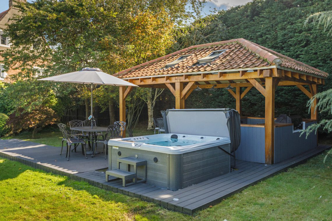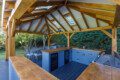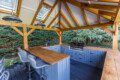 Large enclosed dog safe back garden, with wrap around decking leading you up to the garden gazebo and newly renovated entertaining area and an outside ping pong table for your enjoyment. 2 drinks fridges, outside sink and BBQ along with a 6 seater hot tub and garden seating.