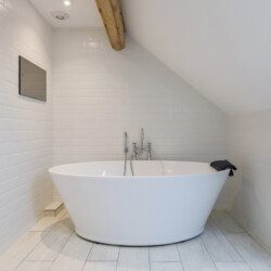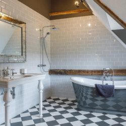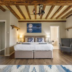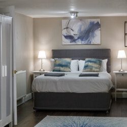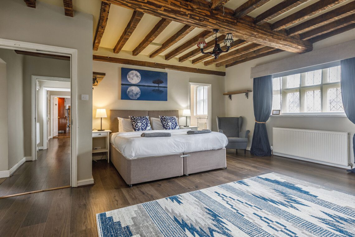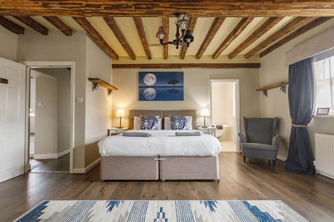Bed 1 – First Floor, super king bedroom, 65 inch tv, ensuite with freestanding bath, shower, toilet and sink.
