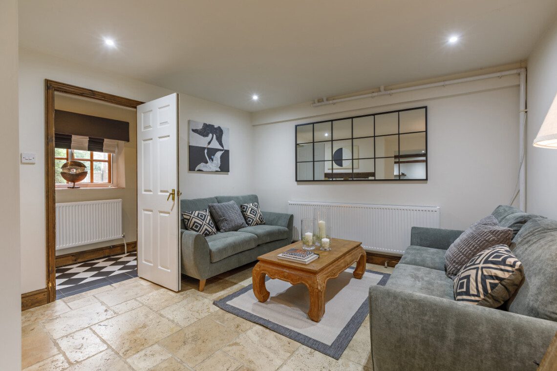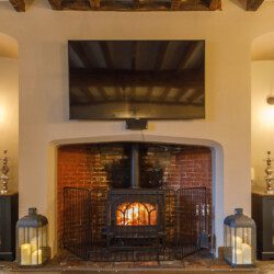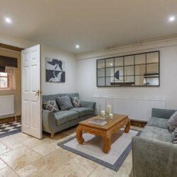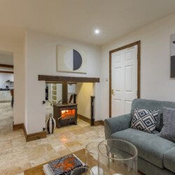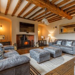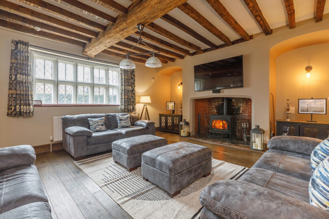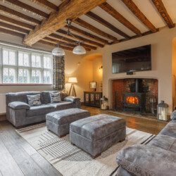 The sitting room is to the left of the front door with a huge log burner, large 55 inch tv on the wall and 3 large sofas easily seating 10 people.