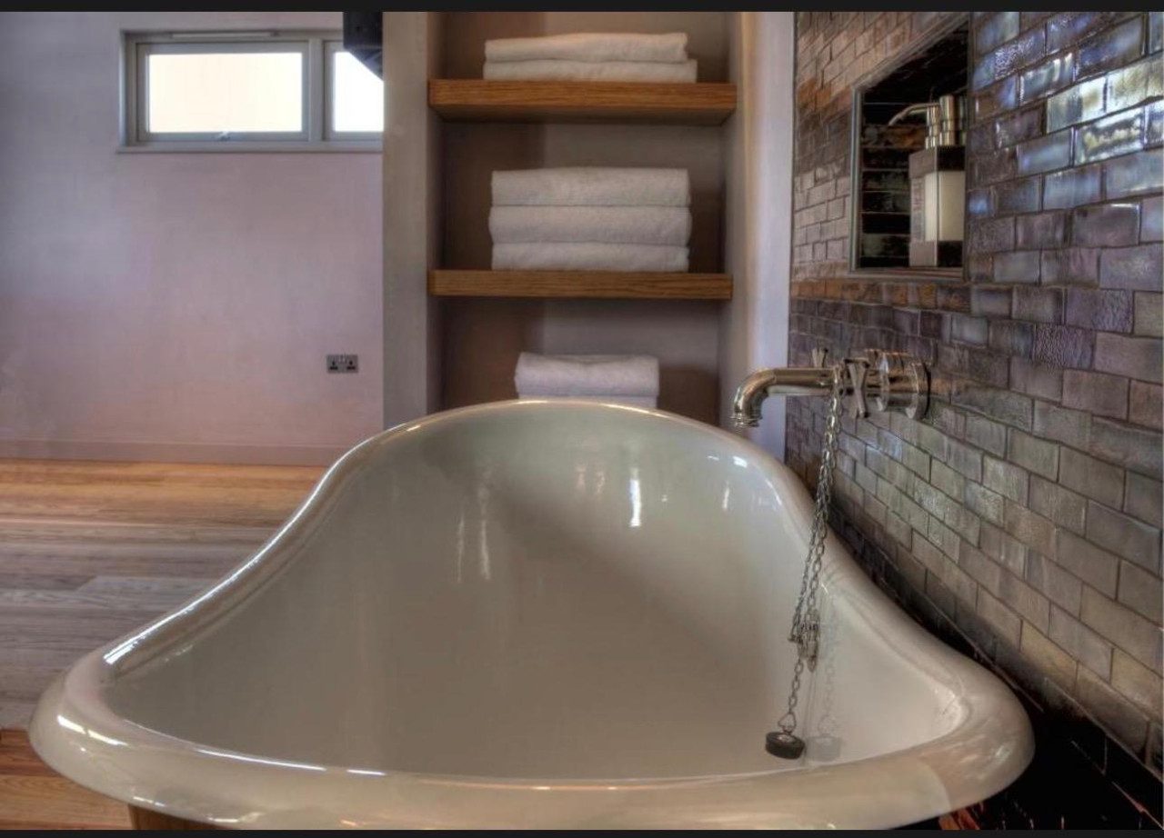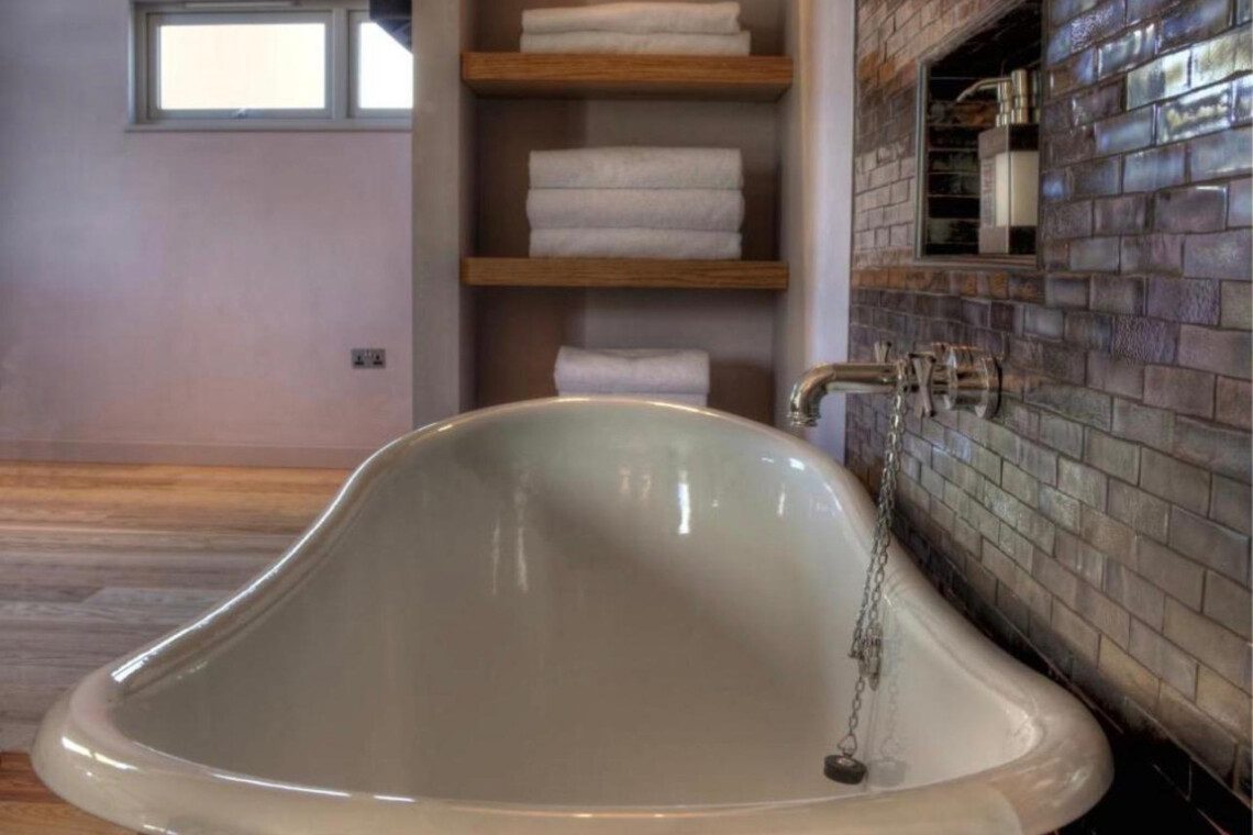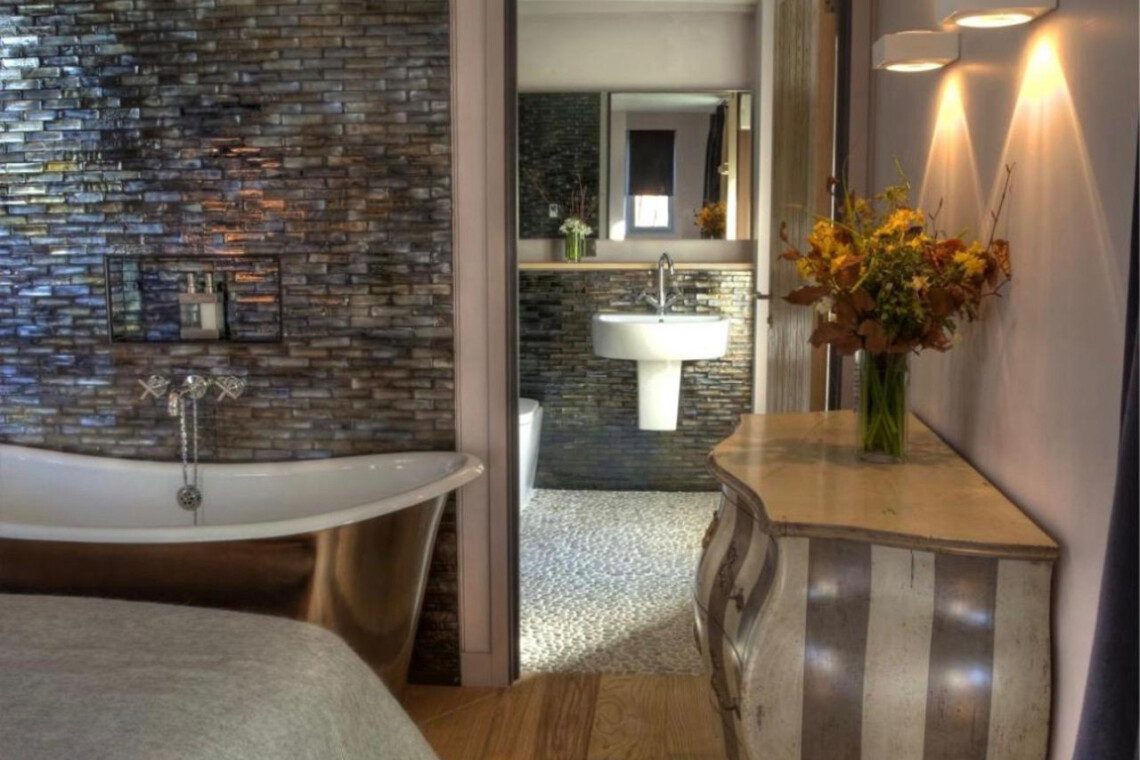 The spacious bedroom features a sumptuous 6ft king-size bed, dressed in high-quality linens to ensure a restful night’s sleep. At the foot of the bed, a stunning freestanding copper bath adds a real touch of indulgence, creating a boutique, hotel-style experience in the comfort of your own private space.