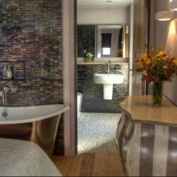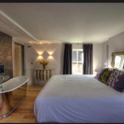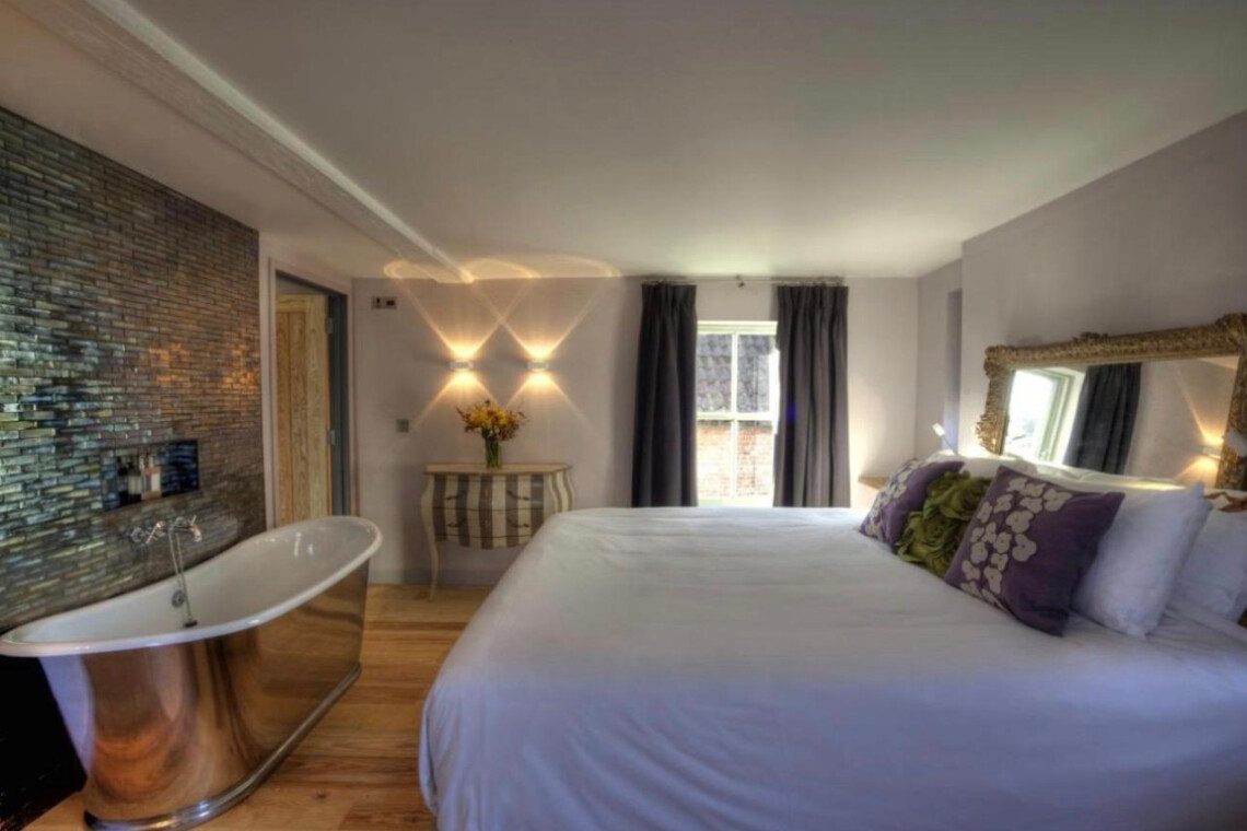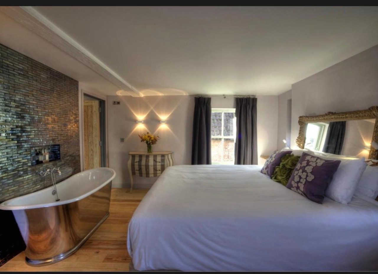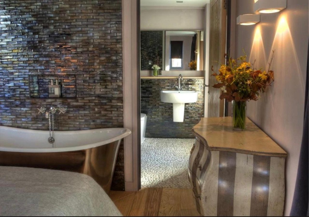 The spacious bedroom features a sumptuous 6ft king-size bed, dressed in high-quality linens to ensure a restful night’s sleep. At the foot of the bed, a stunning freestanding copper bath adds a real touch of indulgence, creating a boutique, hotel-style experience in the comfort of your own private space.