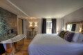 The room is filled with natural light from large windows and thoughtfully styled with warm tones, elegant furnishings, and unique decorative touches. A separate bathroom includes a modern shower, offering both practicality and comfort.