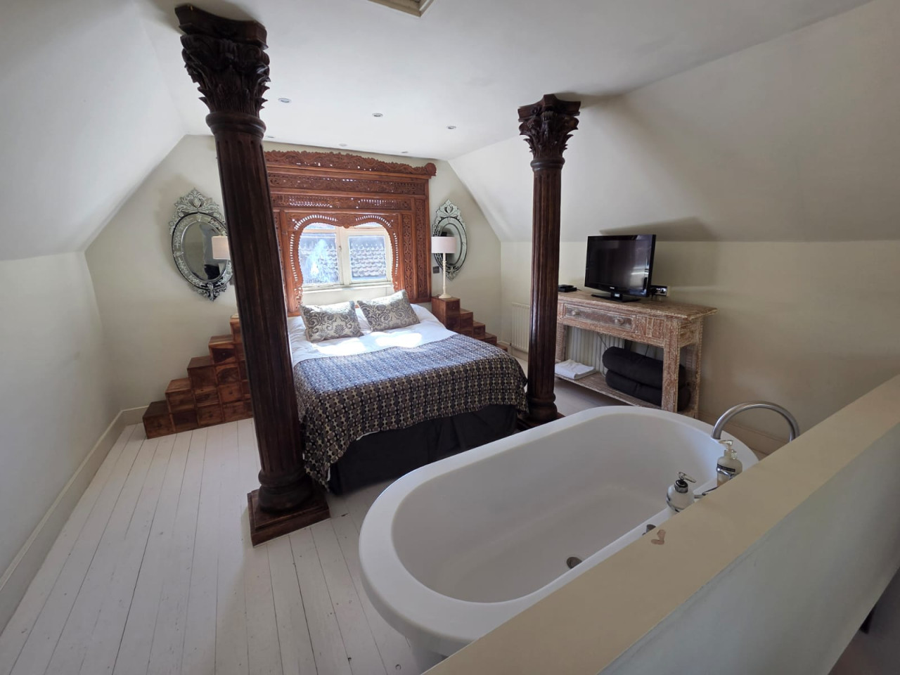 This unique split-level suite blends warmth, luxury, and individuality. Upstairs, you’ll find a stunning 5ft king-size bed framed by an ornate four-poster, creating a cosy yet elegant space to unwind. At the foot of the bed, a freestanding bath adds a touch of indulgence—perfect for a relaxing soak after a day exploring Norfolk.