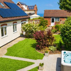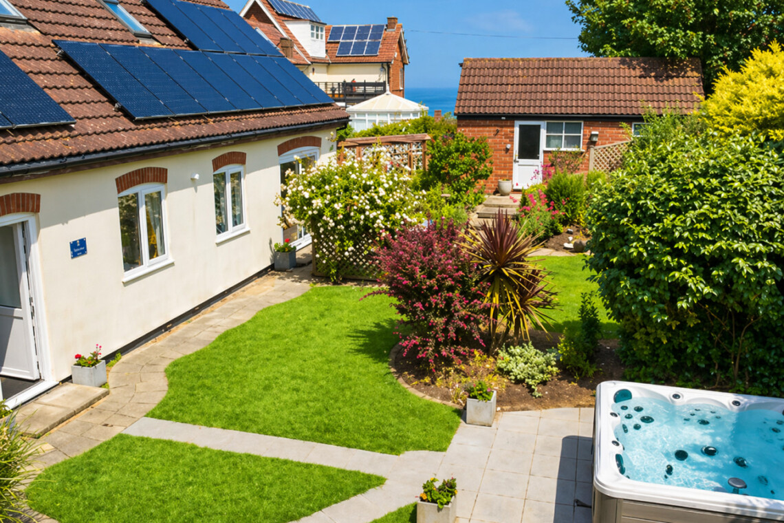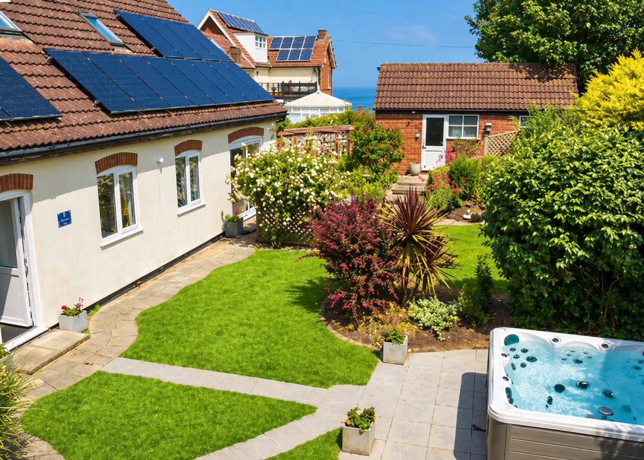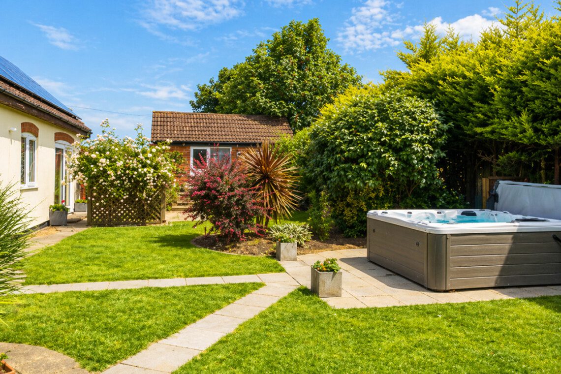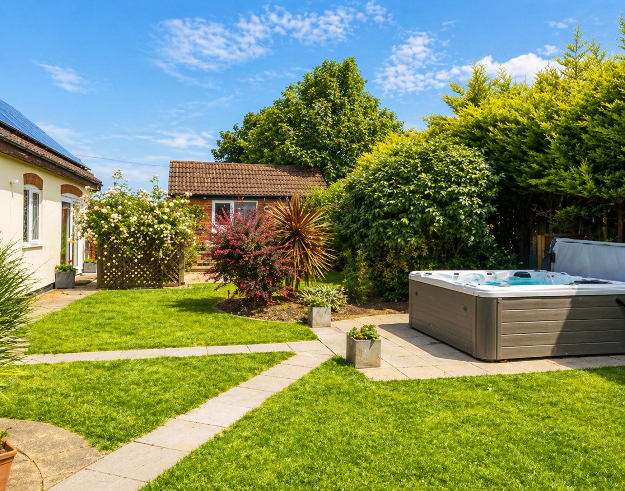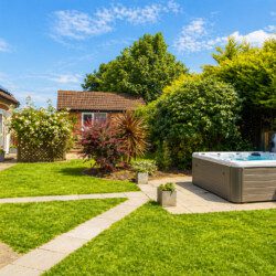 A secure garden with lawned area, shrubs, charcoal BBQ, rattan seating and tables and a hot tub.