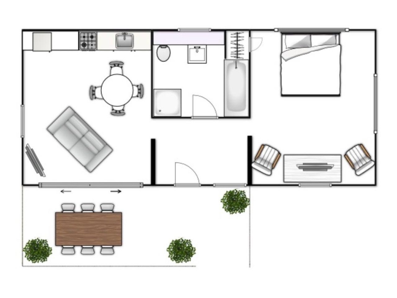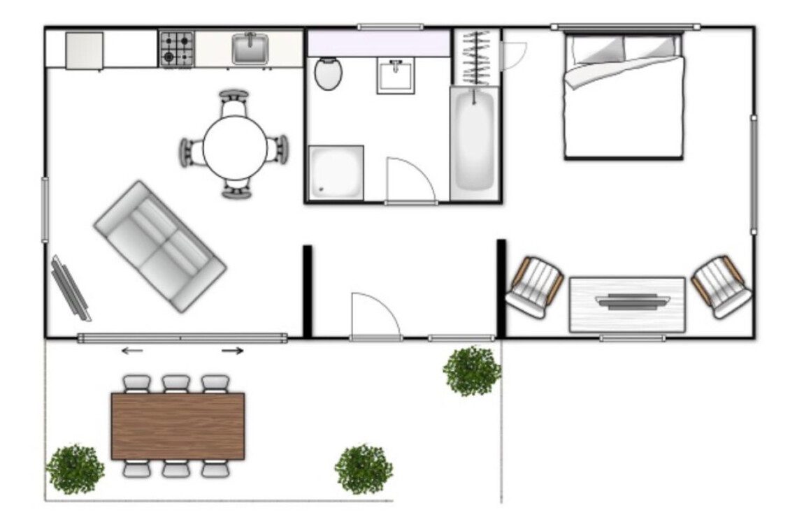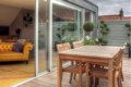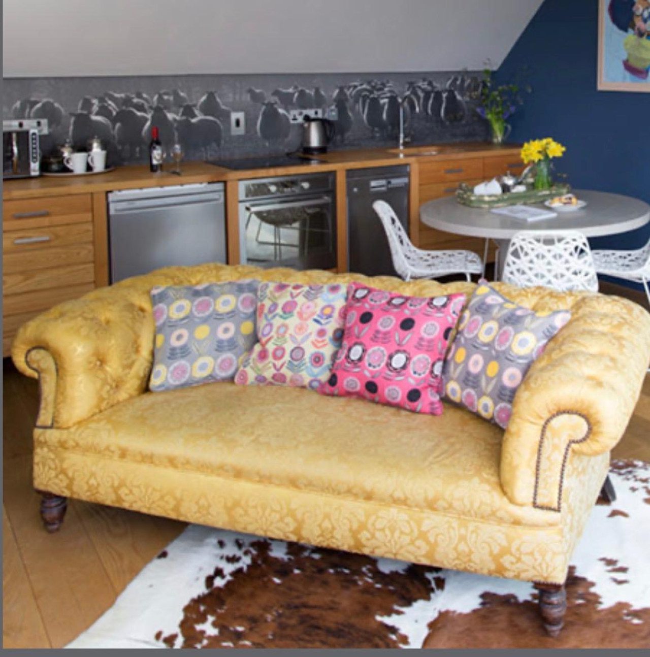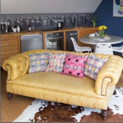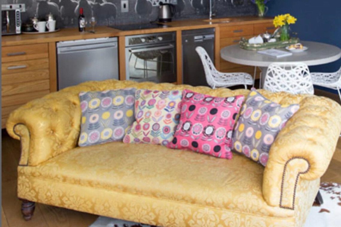 The space features a bright, open-plan layout with a fully equipped kitchen, dining area, and a cosy lounge complete with a striking statement sofa—ideal for relaxing after a day exploring. Large sliding doors open onto your own private decked balcony, perfect for morning coffee or evening drinks in a peaceful setting.