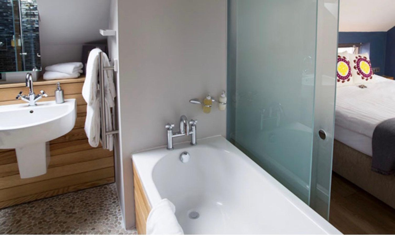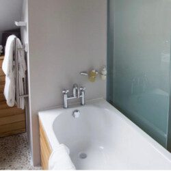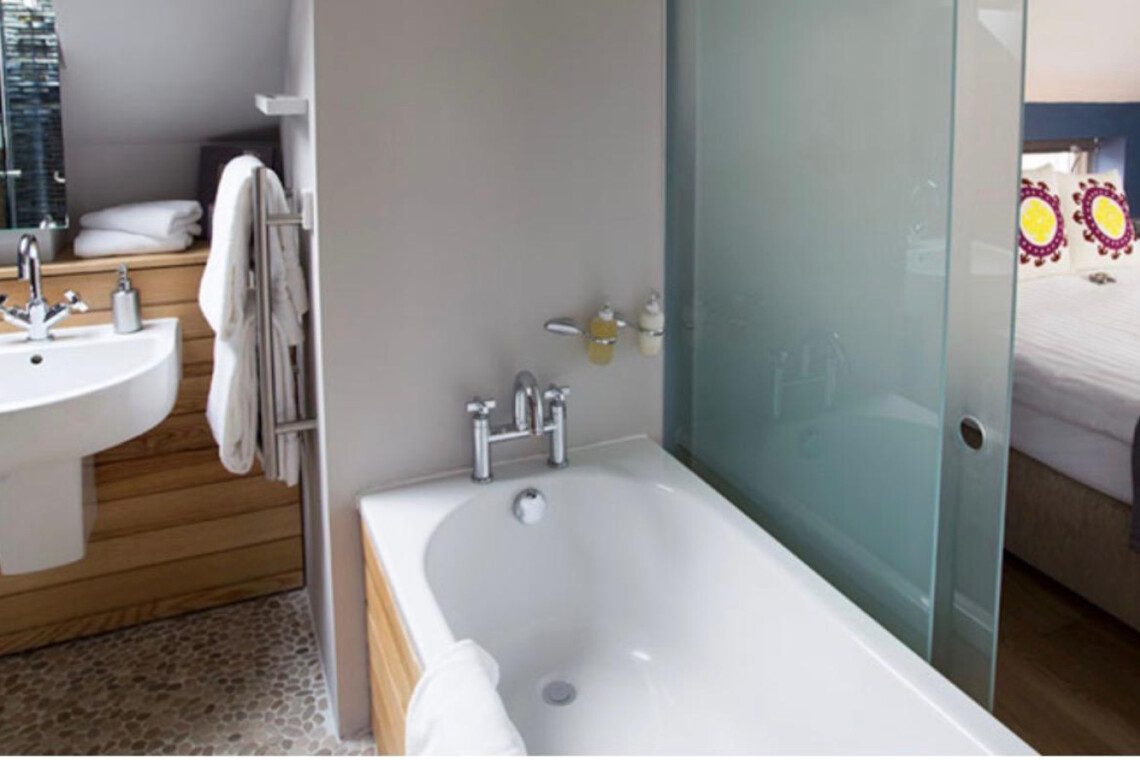 The bedroom offers a luxurious 6ft king-size bed (which can also be configured as a twin), ensuring a comfortable stay for couples or friends. A modern bathroom includes both a bath and separate shower for added convenience.