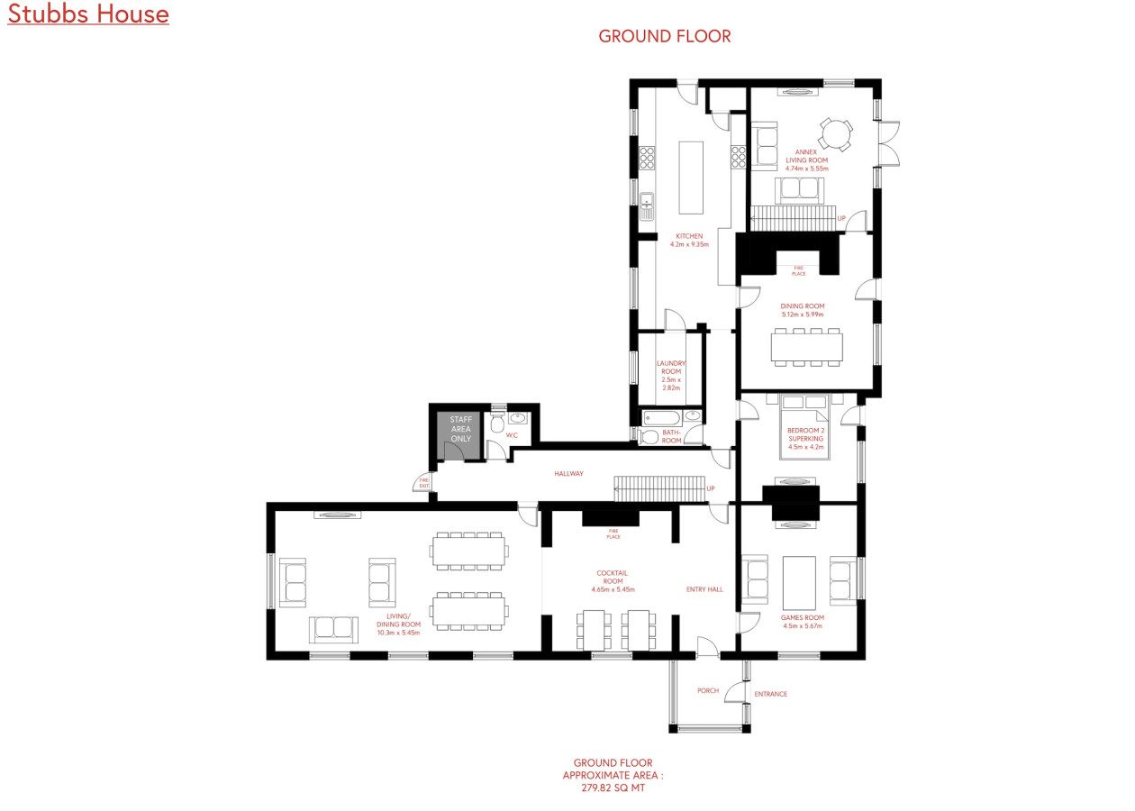 As you enter Stubbs House you will see the room in which you will probably enjoy the majority of your stay, comfy sofas your whole party can gather by next to dining tables to seat everyone and cocktail tables laden with champagne glasses to ensure your stay is perfect. Doors can be opened which lead to the back garden.
