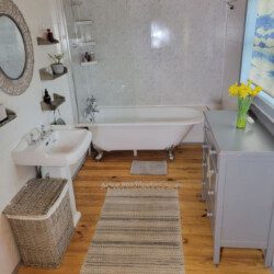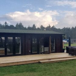 The cabin is self-contained and has everything you need! There is a large bathroom (toiletries and towels provided) with a toilet, bath and shower, and a fully equipped kitchen with oven, microwave, fridge, freezer, toaster, kettle, dishwasher and washing machine.
