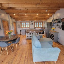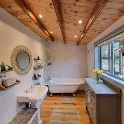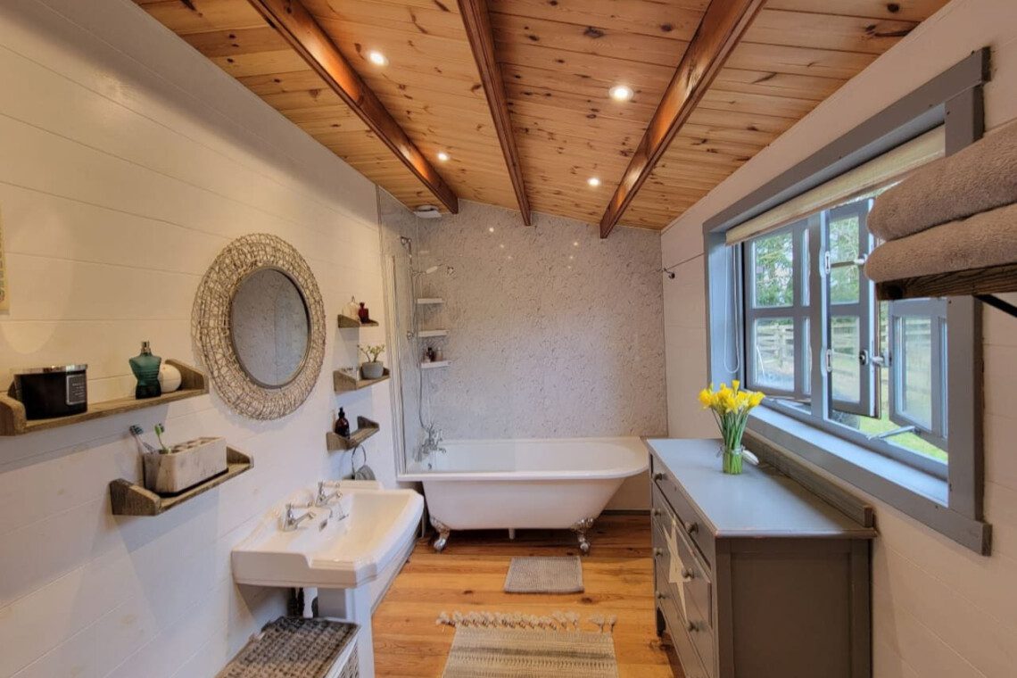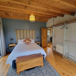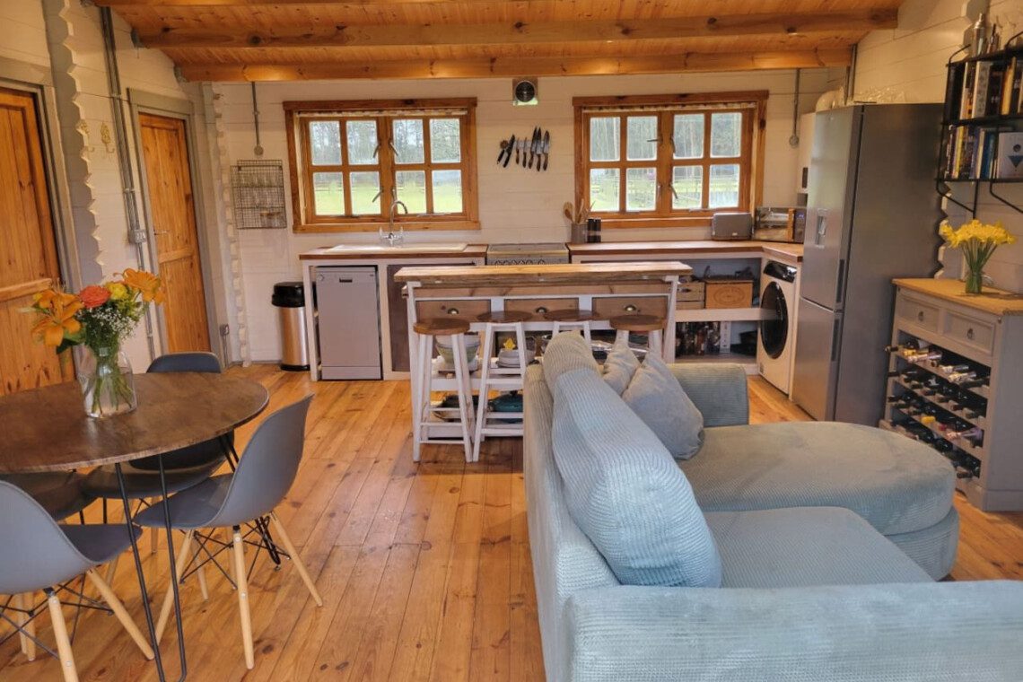 This unique, cosy, hand-built cabin with stunning views of the surrounding countryside is the ideal escape for couples. The Retreat has everything you need: a comfortable and stylish open plan kitchen/living/dining space, a bedroom with a king-sized bed and beautiful views, and a large bathroom with a single-ended roll-top bath to relax in.